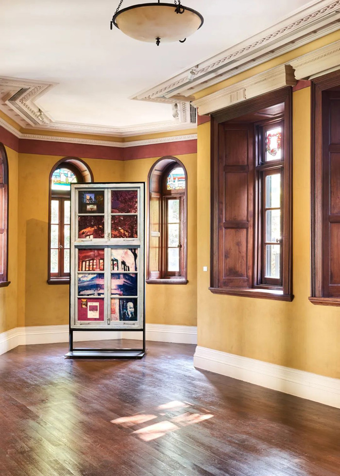 “李青:后窗”展覽現場,上海Prada榮宅,攝影:朱海,2019,上圖中央作品《迷窗·榮宅》中里所畫的建筑就是榮宅本身