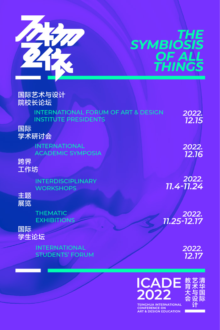 2022年12月15日,由清華大學主辦,清華大學美術學院承辦的2022清華國際藝術與設計教育大會在線上數字會場中推出。來自英國皇家藝術學院、英國格拉斯哥美術學院、意大利米蘭理工大學設計學院、日本武藏野美術大學、新加坡南洋理工大學以及中央美術學院、中國美術學院、廣州美術學院、魯迅美術學院、上海大學上海美術學院、香港理工大學設計學院的院校長,與清華大學領導、清華大學美術學院師生和各界嘉賓齊聚數字會場,共同拉開本屆國際藝術與設計教育大會的帷幕。
