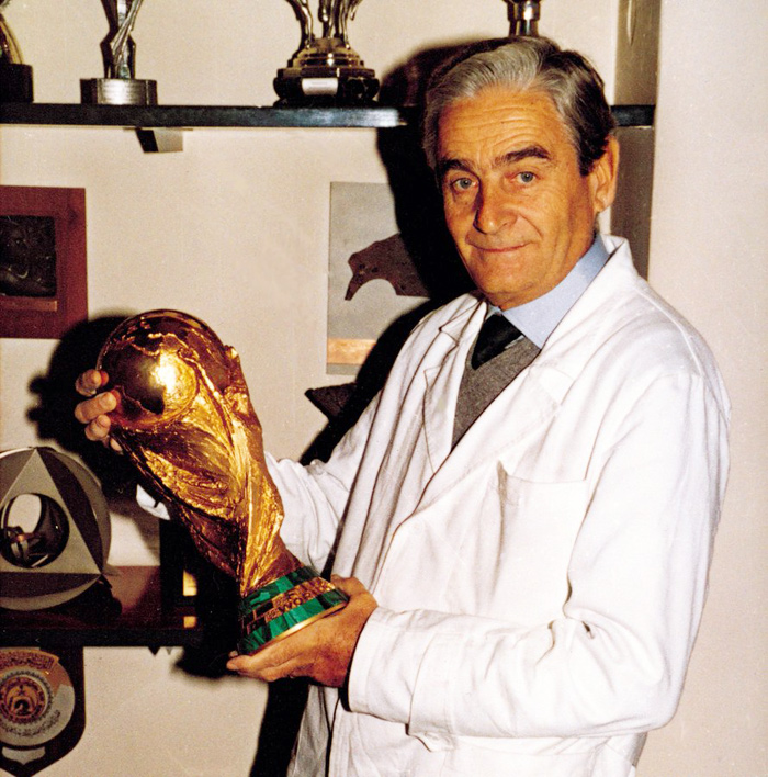 再說回原作者,按照國際足聯的規定,西爾維奧?加扎尼加的設計在被選中后就失去了對獎杯的設計專利權,盡管沒能從中直接獲益,但他開始收獲越來越多的設計邀請。緊接著的兩年內,歐足聯先后找到他設計了包括當年的聯盟杯以及歐洲超級杯的獎杯,之后各種獎杯設計邀約不斷,包括棒球、籃球、排球、游泳、滑雪等等,且他擁有可以在獎牌上簽名的權利。