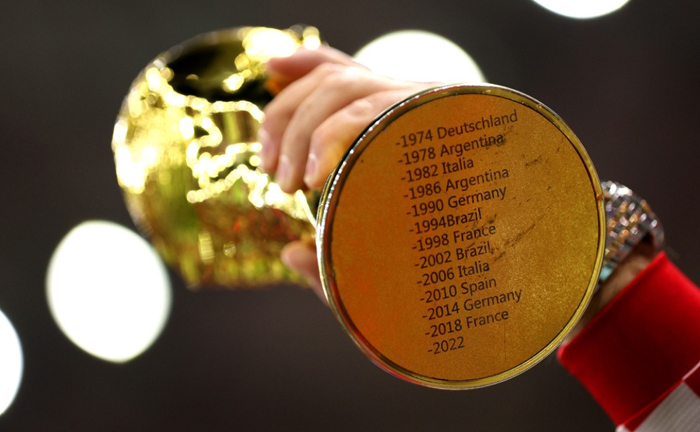 獎杯底座直徑13厘米,上面刻有1974年以來所有奪冠球隊的名字和年份,面積可以容納17個獲獎國家和年份的名字,也就是能記錄下到2038年所有的世界杯冠軍。