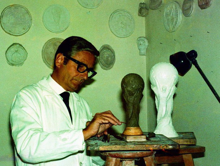 西爾維奧?加扎尼加1921年1月23日出生于意大利米蘭,在二戰期間長大,青年時期對高級珠寶和米蘭建筑設計感興趣,十幾歲時就設計了人生第一枚獎牌,接下來的30年里,他一直致力于珠寶和滑雪獎杯的設計,最后升任米蘭Bertoni公司的創意總監和主雕刻家。這家公司正是一家專門生產文化以及體育等領域獎杯、獎牌、獎章、紀念章等物件的制造商。