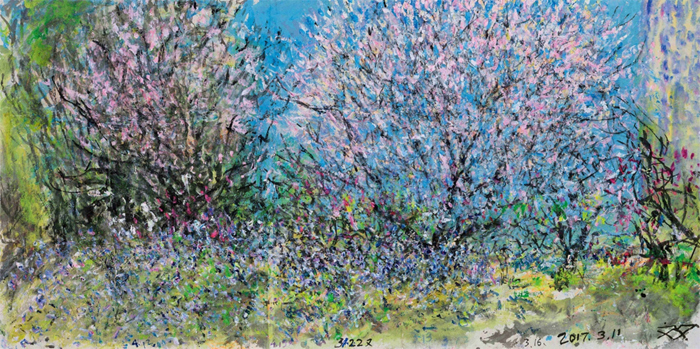 李玉雙 Li Yushuang,桃花三月,墨水 亞克力 素描 紙本 | 97.2 x 197 cm
