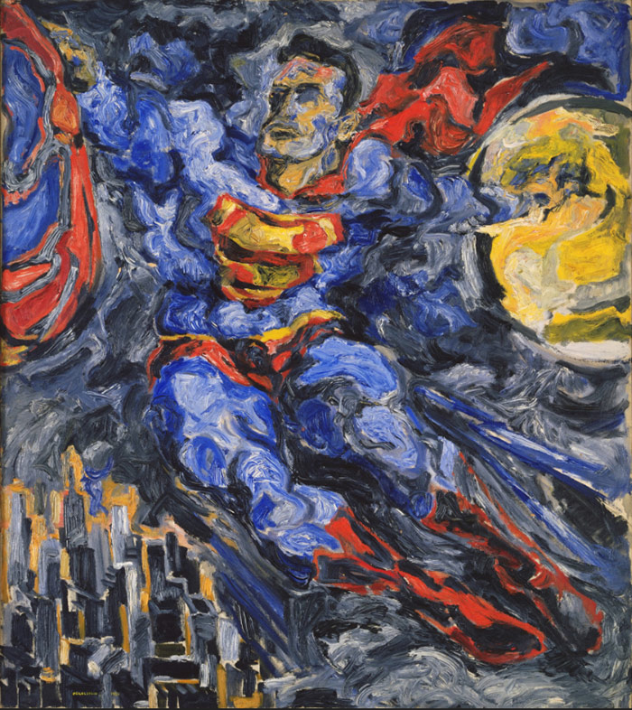 他的早期畫作(他后來稱之為象征主義時期)是色彩鮮艷的抽象畫,融合了一些不尋常的形狀。在波普藝術出現之前,他還畫了一系列基于美國符號的畫作?!俺恕保?952 年)展示了一個肌肉發達的超級英雄在曼哈頓天際線上飛過厚厚的彩繪暴風云,這個姿勢模仿了米開朗基羅在西斯廷教堂天花板上的畫作“光與暗的分離”中的上帝形象。