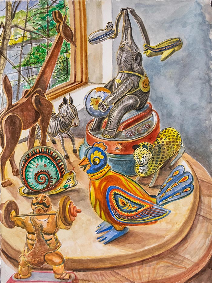 舊玩具,圓桌會議,2021,紙本水彩(圖片來源:lewallengalleries.com)