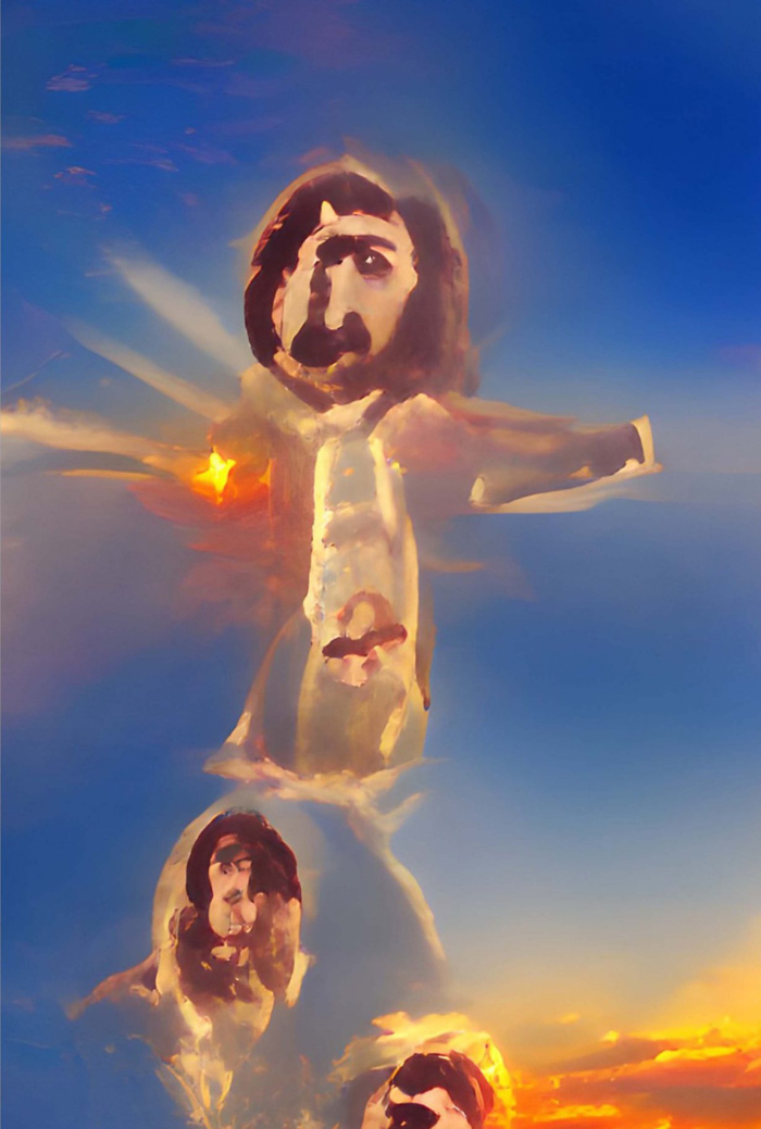 如果我已經選擇用傳統畫筆和畫布創作“耶穌和剩下的兩個吃太陽的披頭士”,那么再用Wombo來進行AI創作時,它便不會再畫出這樣的作品。而我現在正在使用人工智能工具,為“耶穌和剩下的兩個吃太陽的披頭士”進行創作。