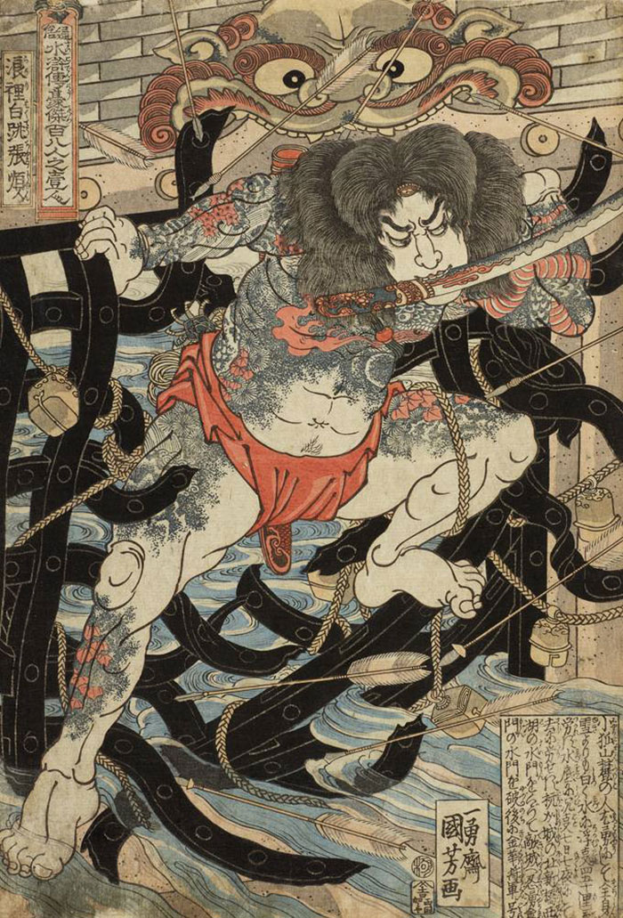 江戶時代的日本正值中國明清時期,盡管當時的日本實行“鎖國”政策,但仍與中國維持貿易往來。這一時期在中國誕生的許多文藝作品,比如《三國演義》《水滸傳》等古典小說不僅在中國社會廣為流傳,在日本也極具人氣,并成為浮世繪的重要題材。著名浮世繪畫家歌川國芳就曾以《水滸傳》中的英雄為對象,創作《通俗水滸傳豪杰百八人》系列浮世繪作品。