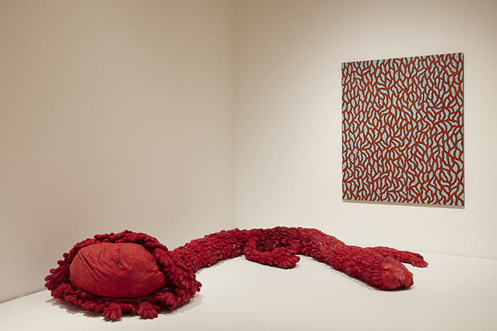 《紅色的花》(1980)和《溫柔是通往天堂的階 梯》(1990)于“草間彌生:一九四五年至今” 展覽現場,2022 年 攝影:鄭樂天 M+,香港