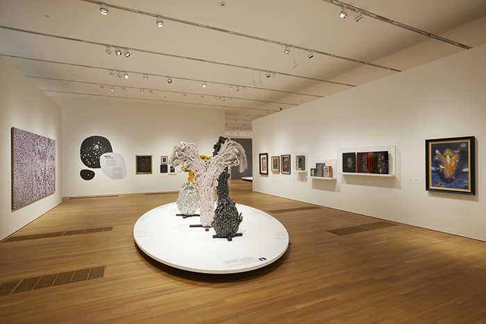 第二對主題是“全面連結”與“生物宇宙”,這兩個主題也是本次回顧展的核心,因為它們詮釋著草間彌生獨特的哲學思想。我總是說,如果草間彌生只是一個用可愛的波點去涂繪南瓜的藝術家,她的藝術魅力無法持續這么久。她的藝術作品之所以能有如此恒久的魅力,就在于她的藝術語言所具有的無一物二的哲思,非常的深刻也充滿了人性化的力量。草間彌生除了藝術創作之外還熱衷于文學創作,她書寫著自己的觀點,認為人類需要清空自己,需要消融自我,然后人們就能重新在藝術作品以及無限中互相連接。草間彌生在60年代就已經開始探討這些概念,在互聯網、社交媒體以及全球化出現的幾十年前,草間彌生已經以重要的哲學方式開始思考“全面連結”的概念。在草間彌生的世界觀中,“生物宇宙”是指在微觀世界中的細胞和分子與宇宙中的星球和星系很相似。在草間彌生的畫作中,很多元素都像是在顯微鏡下才能看到的正在分裂的細胞,畫作本身就像是一個培養皿,也像是遙遠的星系。微觀世界與宏觀世界在草間彌生看來是一致的,是一個硬幣的兩面。