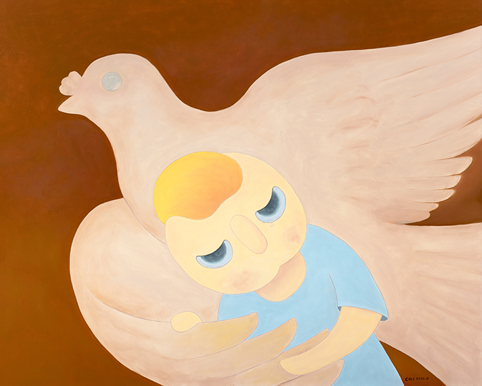 比如我在2022年創作的《和平》,雖說我們身處的這個世界中依然有沖突、暴力、貧窮,但是回看我們國內和平安寧的這種生活狀態,就更應該倍感珍惜,更應該擁抱和平。所以我在創作這幅作品時就展現了和平鴿與“yy”之間的一種互動關系,兩者之間是一種互相擁抱的狀態?!皔y”用手輕輕抱住和平鴿翅膀的動作,就是想要留住和平,保持和平。