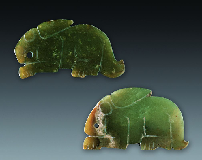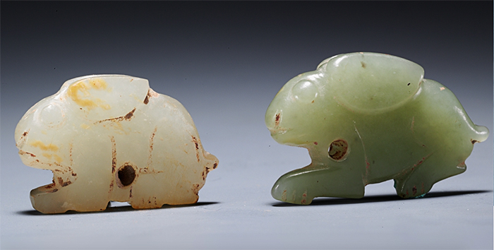 除了青銅器外,商周時期的玉器也常為兔形。這兩件玉兔雕刻的形象很相似,都是側視扁平化的兔子。兔子有著圓眼長耳,肥碩的身體與短短的尾巴。在兩片偏綠色的玉上分別以明刻線雕刻出兔子的身體輪廓以及細部,形象簡潔質樸,分別穿一孔洞,可能曾用來系繩。