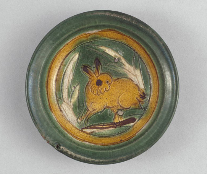 兔的形象也常出現在瓷器上,伴隨著歷朝歷代瓷器的發展衍變,被描繪在日用器皿如盤、碗、盆、碟中,也有的寓意“玉兔思鄉”,以兔子的形象表達對故土的懷思。在遼代已有三彩刻花的兔紋小碟,在綠釉底上線刻出了一只在飛奔中回首遙望的黃釉兔子,旁邊以線刻描繪出草葉植物。
