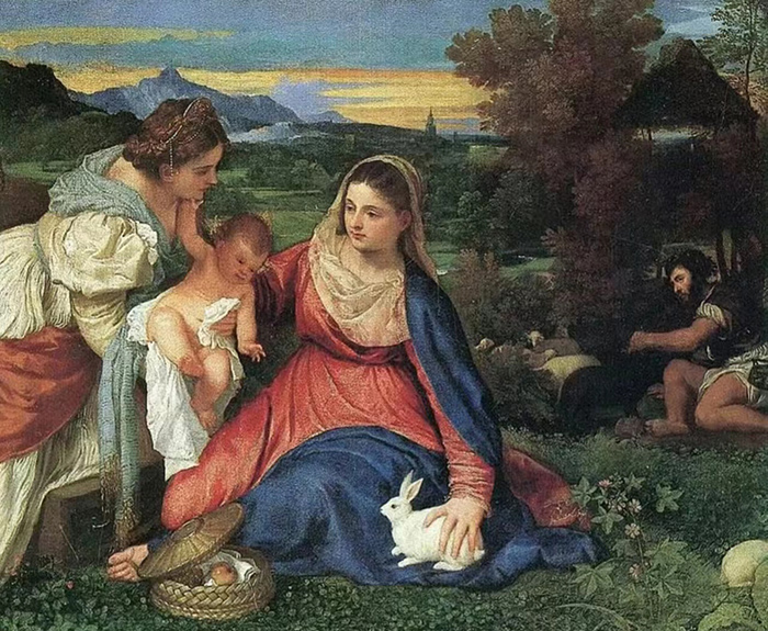這同樣是一幅有圣母和兔子的作品,作者是著名藝術家提香。在這幅作品中,圣母采取傳統的金字塔形結構穩定手撫白兔。畫中色調和諧,藍綠色的斗篷與紅色衣服形成互補,又由白色點綴,金黃色的曙光賦予畫面寧靜、祥和而神圣的情感色彩。
