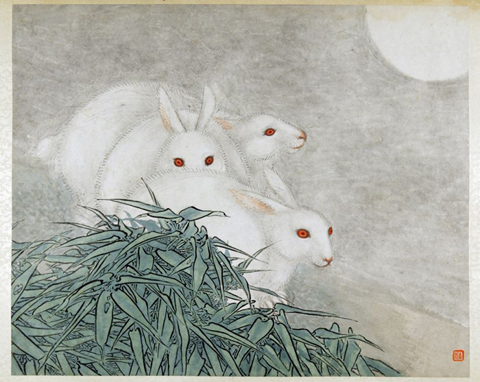 晚清海派“四任”之一的任預在十二生肖圖冊中分別描繪了不同的生肖動物。其中他在畫面的左下方描繪了三只白兔與墨線雙勾填色竹葉,右上方高懸一輪明月,以對稱的方式進行畫面的布局。任預以中國傳統的暈染技法來表現白兔的圓潤體態與絨毛的造型,紅色的兔眼有畫龍點睛之妙。畫面虛實結合,純凈素雅。