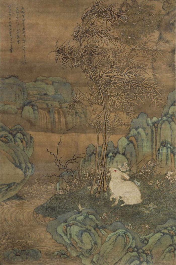 另一幅《蟾宮玉兔圖》中將花鳥與青綠設色的全景式山水畫相融合,只以一只墨竹下的白兔象征月亮。白兔的形象與上一幅畫作中的相似,但所面向的方向相反。陶成以筆尖簇點,層層染色,再勾勒出兔子的絨毛,表現出了白兔的潔白與靈動,也展現出了畫面的典雅工細和畫家的高超繪畫技藝。
