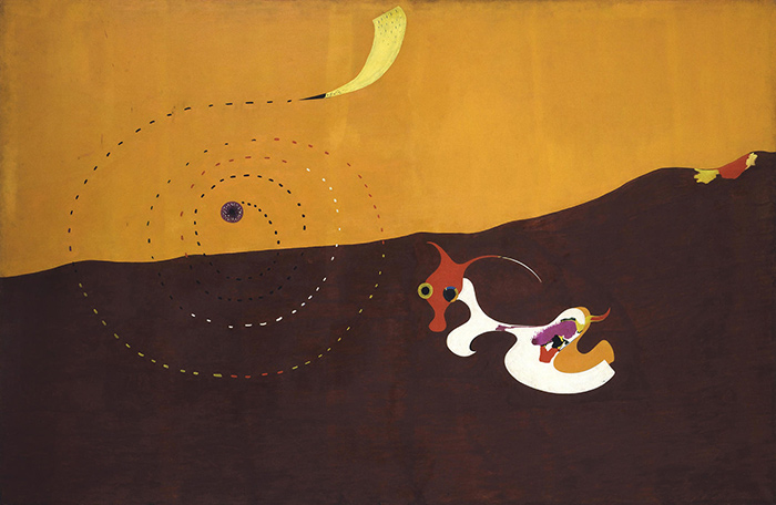米羅筆下的兔子具備強烈的超現實主義色彩,兔子的軀體似流體般扭曲,和暮色融為一體。