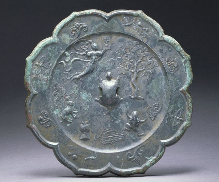 以嫦娥玉兔為題材的還有這件八瓣菱花鏡。在銅鏡的背面正中有一龜形,四周分布著枝繁葉茂的桂樹,手持“大吉”與托盤身姿飄逸的嫦娥,搗藥的玉兔跳躍的蟾蜍以及一潭池水,周邊還裝飾著花卉、蝴蝶以及云紋。正是對于“嫦娥奔月”和“玉兔搗藥”故事的描繪。
