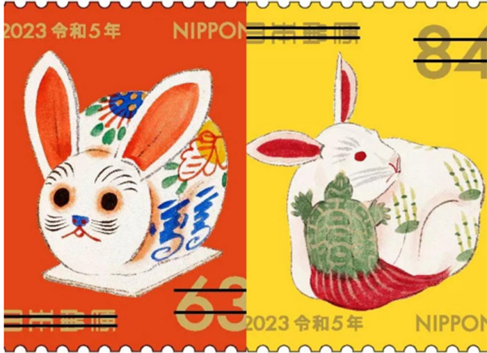來自日本的2023年紀念郵票,選用了繪畫師川崎巨泉設計的日本鄉土玩具,由設計師吉川亞有美進行設計。63日元郵票圖案為三春張子兔,84日元郵票圖案為名古屋榮國寺兔子存錢罐,昭和氣息躍然紙上。
