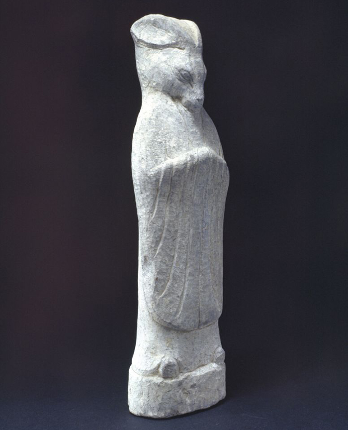 這一唐代生肖兔以青石雕刻而成,頭部雕刻為兔首,兔耳緊貼頭部,眼睛、鼻子以及嘴部屬兔,身著交領廣袖長袍直立,于胸前拱手,身體為修長的人形。另一唐代紅陶生肖兔同樣為兔首人身,身著文官長袍,于胸前拱手,可能曾手持笏板,形象簡潔洗練,表面敷有赭色彩繪。唐朝典章以十二生肖隨葬,以鼠居北正中,順時針方向分布排列,起到鎮墓作用。
