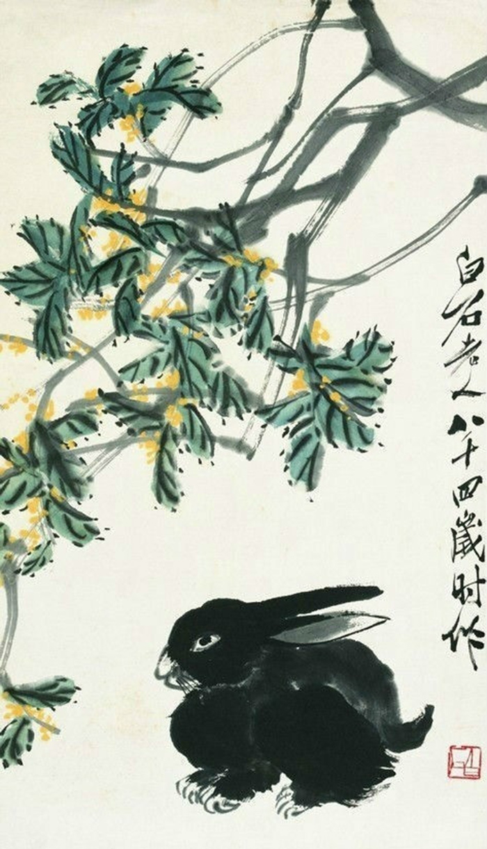 除蝦外,白石老人與兔的故事也令人稱道——為了畫好兔子,他曾親自養了數只黑白兔子,常常仔細觀察他們的生活習性,以及細微動作。在觀察的基礎上,他創作出了一批精彩傳神的兔子畫,一時吸引慕名而來的人,成群結隊來上門“買兔”。
