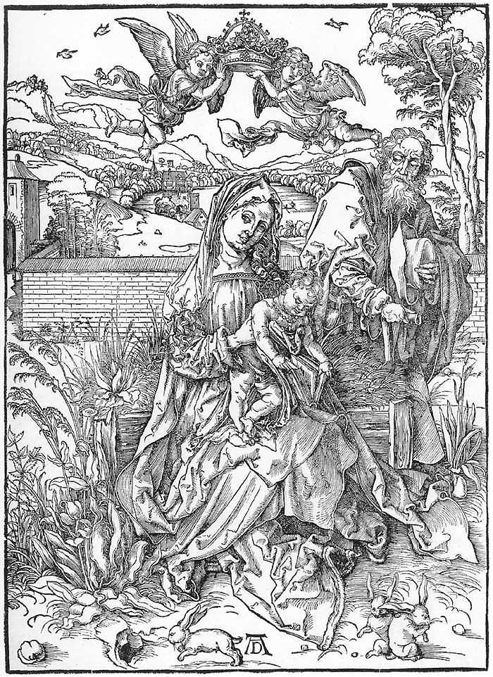 木刻版畫《神圣家庭和三只野兔》同樣出自丟勒之手。作品描繪了在花園中的圣母瑪利亞,懷中的嬰兒耶穌和圣約瑟。腳下的三只小兔子吸引了耶穌的目光。