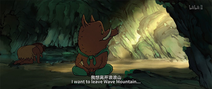 國漫《中國奇譚》為我們帶來這樣一只小豬化身的妖怪:到人間鎮上跑腿不忘給媽媽和弟弟妹妹捎帶包子,入選大王洞、榮光璀璨的家中頂梁柱;整日受教頭呼來喝去,因著一身好使的鬃毛淪為煮唐僧肉的擦鍋布;被母親寄予厚望、叮囑著多喝水,家人眼里的掌中寶;連妖怪大王的面也不曾見過,只干些粗活累活的職場邊角料。當我們依循著小豬妖的沉浮,在緊鑼密鼓的打雜日常中忙里偷閑,回自家的洞穴坐一坐,目光朝山石洞口望去,只見燦爛新陽傾瀉下來,飛鳥啁啾懸停,媽媽的叮嚀猶在回轉,循環往復的時間仿佛悄悄裂開一個小口透進新鮮空氣,自由的靈光就在此顯影了,小豬妖像在告知媽媽,又似在囑咐自己般地囈語:“我想離開浪浪山?!?/p>