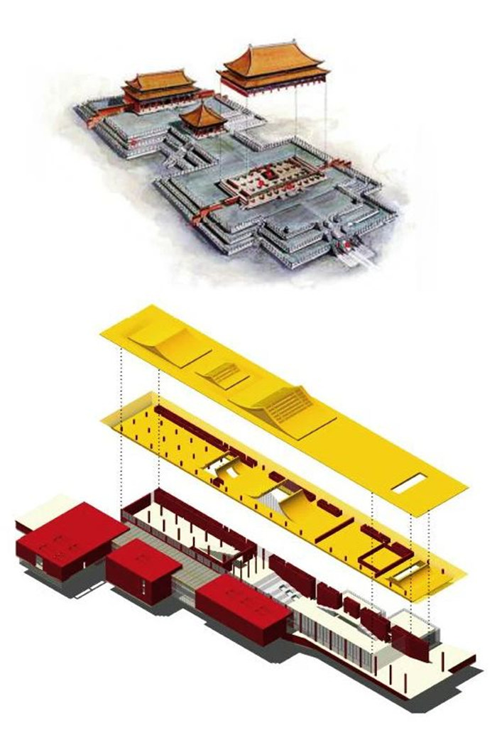 和原故宮本體的南北朝向軸線,故宮博物院北院區東西橫放,可建設用地地塊狹長、形狀不規則,東西長約900米,而南北最窄處僅60米。在狹長的地形里如何滿足一座現代化博物館的功能?設計團隊反復考量后,在建筑的最終設計規劃中,將對外文物展覽布置在了場地東側,較為私密的文物庫房、修復及后勤功能則布置在場地西側,最大限度滿足功能布局的同時,也有利于分期建設。這種南側臨水、北面疊山的線性格局,同樣呼應了中國傳統“堪輿”理論的理想布局。博物館群落的金頂建筑形成一條軸線,作為整個建筑體量的中樞?!拜S線是形制的根基。故宮有一條中軸線,北院區的中軸線也是寓意故宮核心‘天際線’。我們想通過這種均衡的軸線布局方式與散點的構成邏輯向紫禁城致敬,也是在傳承著故宮的歷史文化底蘊?!?/p>