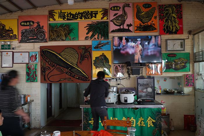 在河南大南坡村,劉慶元的作品《竹林七賢》顛覆了仙風道骨的古典題材,他將村民的形象和場景直接應用到七賢的喝酒、縱歌,肆意酣暢的場景中,創造了一個古今并置,雅俗相融的現代木刻,令人震撼。