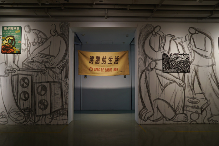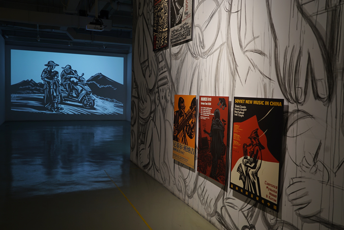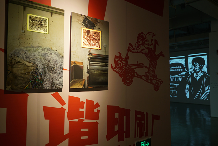 劉慶元:你要在空間里滿足做自己,就要有條件和形式上的支持。21空間美術館空間很大,原來屬于商住的辦公空間,另一個是經費有限,當時大家都陸續被感染了或被封控了,我天天在一線工作但比較僥幸沒有陽,所以這個展覽是要在當下諸多局限和急迫的條件下去操持和行動,這很“木刻”。擠出來的時間更珍貴、更需要效率,我到現場就得知道我要做什么。它不是回顧展,我原計劃是把所有作品放在一個大空間里,無論是影像或木刻、裝置或表演,它就像一個工廠車間,后來還是根據空間間隔做了分布,我在進門大廳擺放2018年創作的上世紀60-90年代28個街頭藝術事件,這有一個導覽的性質,連接大廳的空間是一個木刻劇場的裝置,其中穿插了兩個影像。另外美術館的電梯很大,我就把它轉換為一個日常的辦公公共空間“值班室”,這也跟我的體制身份有關。三層是我這么多年參與不同類型文化實踐的部分內容,影像、海報、出版和墻上的直接繪畫,包括我早期的一些木刻原作,它們統稱為“在和諧印刷廠”。