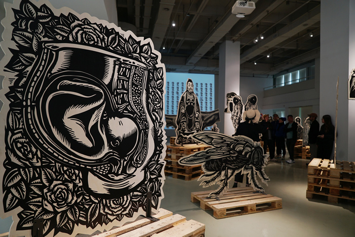 劉慶元:我個人理解當代藝術不是媒體決定論,而是每個個體/階層/種性/族群所處的不同社會語境之下的行動思考和持續介入其中的全球化共振,批評、反思和問題意識應該是一直在被主動生產和迭代轉換的,它是分布各地的、激蕩的能量流動。我用木刻參加各種類型的展覽和活動,或許就是從木刻作為歷史悠久的小眾媒介藝術出發,然后在漫長實踐歲月中彼此適應和改造,木刻本身被賦予的各種表述于我都是重新思考和反向推演,因為當下文化實踐會推著你走,我不太在意身份認同。木刻越有限它給你的實驗性才更有可能性,有限制有規約,這樣才能在被動中發現主動,哪怕只是一點點也是在面對自己的問題,也不必扮演一個媒介解放者。這些年我參加各種文化活動,我都會用木刻來連接不同領域不同的人和事,因為你要把時間和語言放在自己身上生長,自己成為自己的工具,使用者和被使用的工具互為彼此。