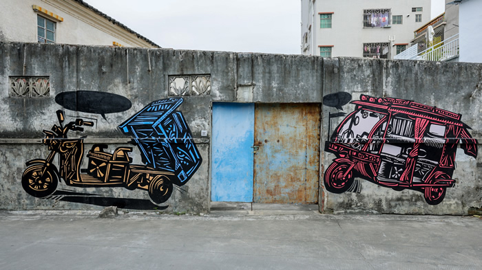 “動如脫兔”是深圳建筑雙年展坪山展區的一個委托項目,主辦方要我壁畫,在征得屋主同意后,我在老屋子墻面里創作了一對“掛著毛巾的,勞動的兔子”的壁畫,還有一系列電動三輪車的視覺作品;我覺得2023開年要有一個比較好的寓意,我,我的周圍,大家都需要互相鼓勁。