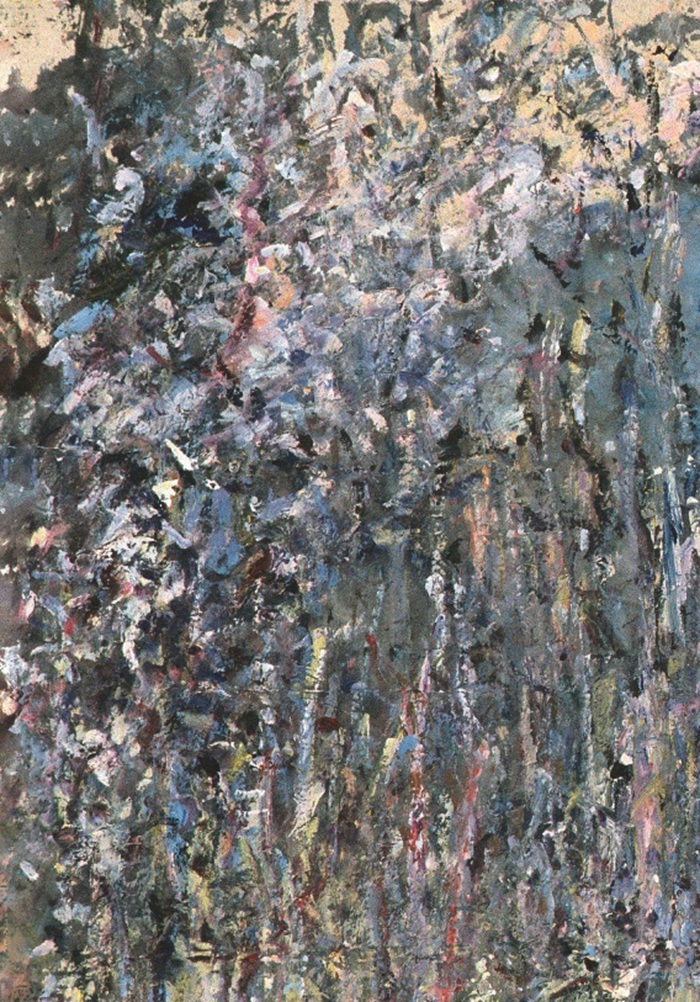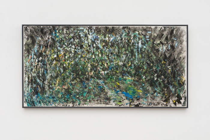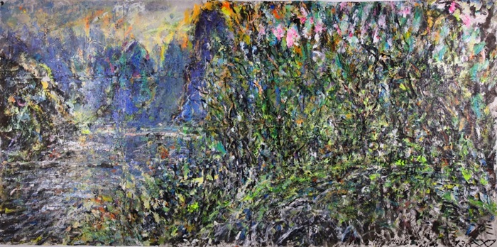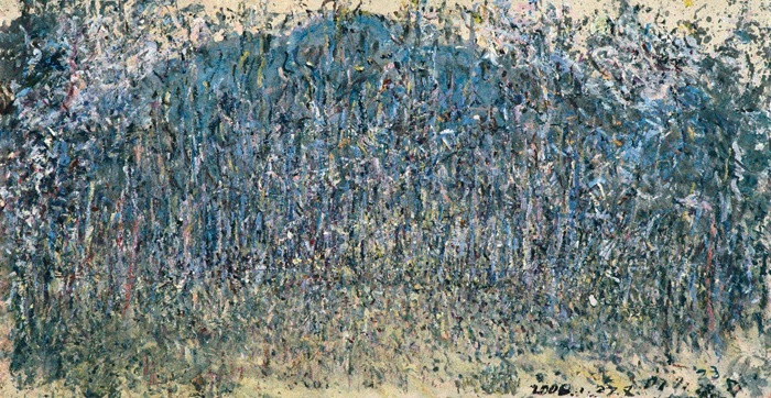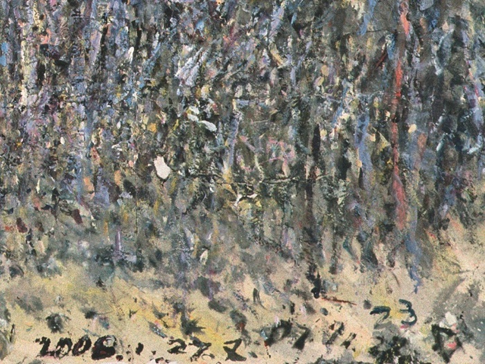 但它不是主體表現主義的——而是讓情感在自然自身的變化,比如枯榮中顯露出來,不是抽象表現主義的——整體看雖然好似抽象繪畫但其實有著無數的風景的細節,季節的草木是得到了客觀表現的,不是中國式寫意——不是縱筆書寫時的大概與簡約化,也不是中國式的寫生——都僅僅是快速潦草地捕獲大意而已,而是深入到無數的細節。這都來自于“光編碼”的繪畫方式,必須持久面對對象,以一根根“線光”及其“光斑”的閃爍,來建構畫面的細節,以及形成整體的氣氛。
