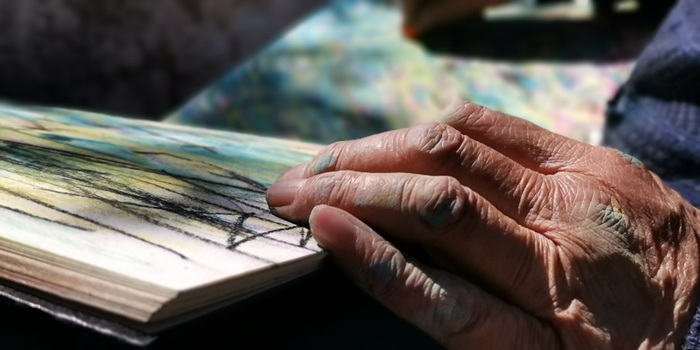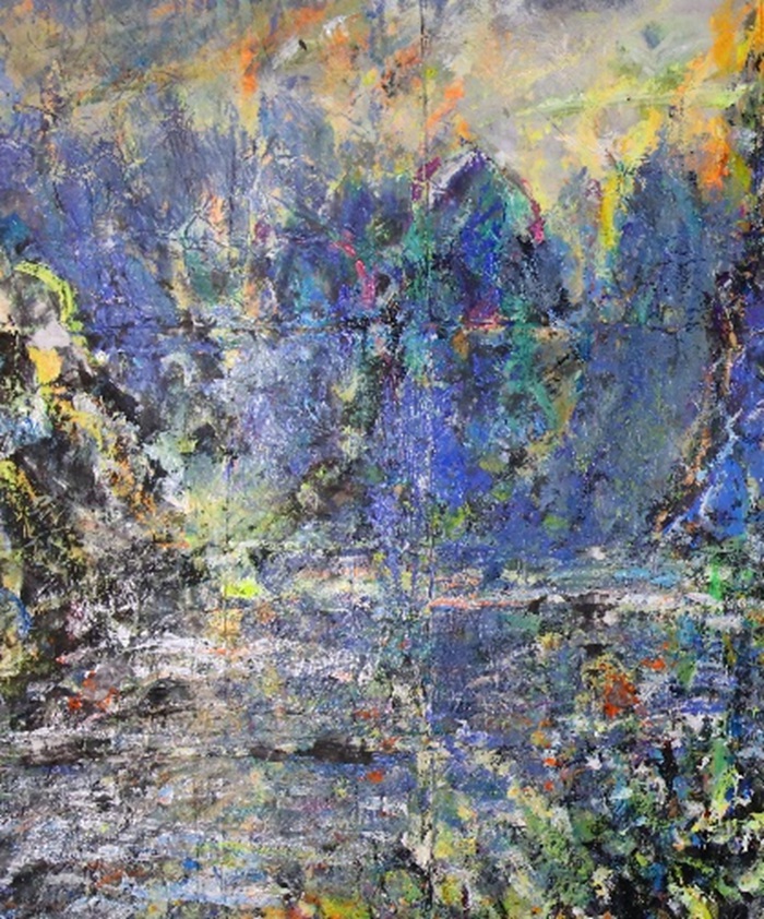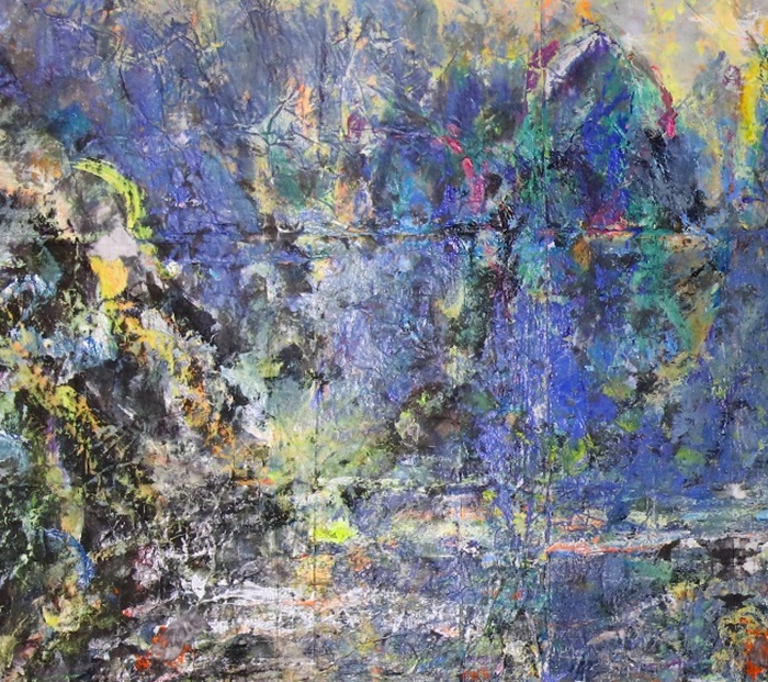 這是持久的坐在自然中,這是道家所言的坐忘:因為持久的與自然共在,觀察自然,體會自然,融入自然,以自然的光感與光斑的線條色彩來感知,通過把自己的大腦視覺轉換為一個照相機式的裝置模型,然后再次改造這個知覺裝置,使之充滿生機,不是機械式的,而是自然自身的組織方式,更為有機化,更為靈動化,充分接納自然自身的細微變化,以及在季節時間中的枯榮轉變,傳達出這個盛衰的轉機變化,就是捕獲到自然的生命力,這個生命力在畫家這里,獲得不同的色調,線條的曲折,就獲得了全然不同于自然的意味,這是把自然自然的靈魂,自然要感知到自身變化的那個靈魂出竅的反觀——被藝術家充分表達在了畫布上,因此,畫布就是自然靈魂自身觀照的某種鏡子,這面鏡子就是光編碼對于自然的忠實,但這個忠實有著時間凝縮的節奏,有著自然永遠不滅而無限再生的熱愛,正是此時間的線條結晶與可再生的愛意,讓李玉雙老人的繪畫總是滿幅飽滿,而幾乎不可停止下來。