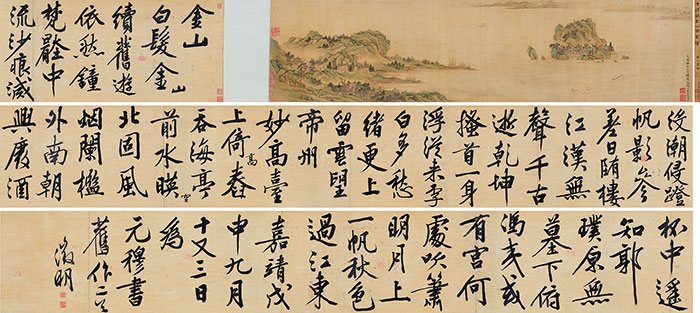 文徵明(1470-1559),金山詩畫合璧卷,手卷,設色絹本、水墨金粟山藏經紙,1548、1549年作