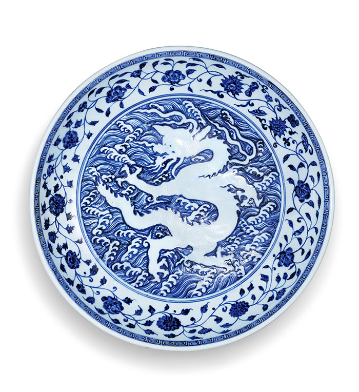 明永樂,青花留白錐刻海濤龍紋大盤(塞倫森龍盤),直徑:40.2cm,高:6.9cm