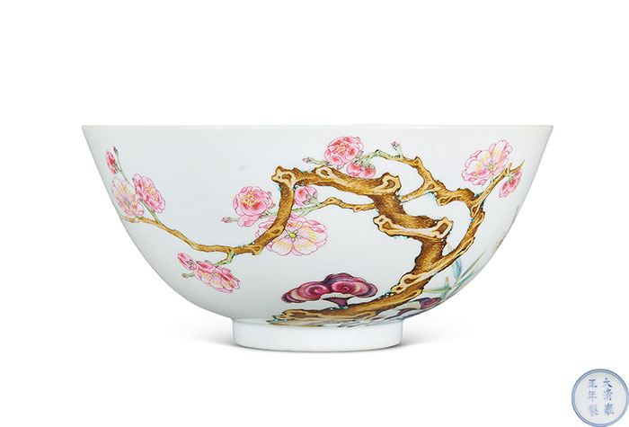 清雍正,粉彩及琺瑯彩“梅竹先春”芝仙祝壽圖碗,“大清雍正年制”款,D 14.3cm,H 6.6cm