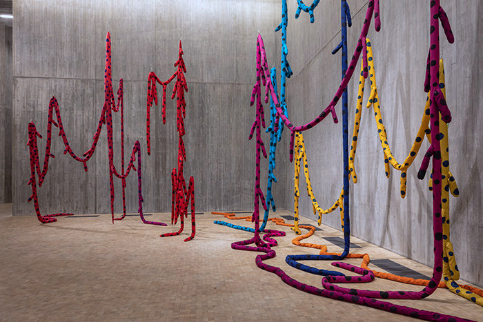 吉竹美香:我覺得這幾件新作品都很特別。其中《神經的死亡》是M+博物館委托創作的,根據建筑空間量身打造,從博物館上方一直垂落到“潛空間”(B2層),由多件混合顏色的軟雕塑組成。這件作品源自草間彌生1976年創作的黑白色作品《神經的死亡》,那時藝術家經歷了一段非常壓抑的時期,這些軟雕塑部分懸掛著,部分凌亂得垂落在地面上。在與之前不同的是這次藝術家賦予了新作更多的色彩與姿態,更加具有活力,代表藝術家克服了重重困難得以幸存。