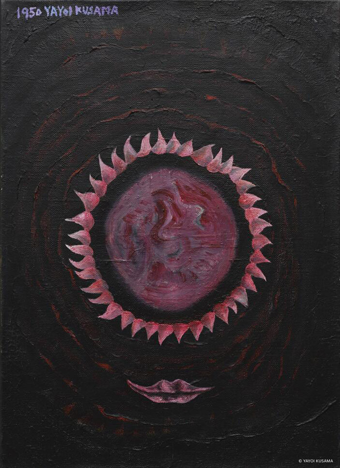 吉竹美香:確實這些都是她在作品中經常表現的主題。在1940-50年代,很多藝術家都在關注這些主題,她所做的是去超越這些主題而不是逃避。作為前衛藝術家,她想要找到一種強有力的藝術表現方式去和現實主義對話。超現實主義實際上就是這樣一種方式,可以看到草間彌生早期的作品中有一些與眾不同的思考,甚至有一種幽默感。比如在草間彌生在1950年的早期繪畫《自畫像》。在這一幅畫中她將自己的形象描繪得像是一朵向日葵,在向日葵狀的臉部周圍有蕩起的漣漪,使得臉部很像是處于漩渦的中心。在這些漩渦的黑色空間里草間彌生描繪了很多細小的“無限的網”,這是她對于這一概念的較早期的表達。這件作品很有趣的是她把自己描繪為一朵花,藝術家的臉被模糊化,自我被消融了。這是什么意思呢?其實當你經歷了不同的時間階段,對于草間彌生來說她度過了自己從1950年代至今這70多年的藝術生涯,隨著時間的流逝,她看待自己的方式以及表達自己的方式也在變化著,她對于人與自然,生與死等這樣宏大的主題的思考也在變化著。