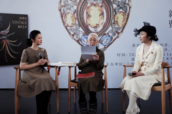 活動后半程,朗誦藝術家詹澤為現場觀眾帶來了精彩的朗誦表演。藝術家趙蘅、古麗斯坦則帶來了各自以Vintage胸針為靈感創作的畫作,并與鄭鶯燕就胸針藝術與胸針收藏的話題展開對談。