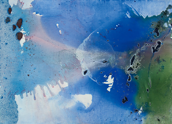 馬路的繪畫材料多是丙烯與綜合材料,這使得他在畫幅風煙中自由揮灑。他依靠丙烯材料的瘦與肥、滯與流、斑駁與滋潤,熟練地制造了諸多的肌理。正是這些肌理,乘著筆的勢、氣的勢,恍兮惚兮,渾茫一片。仿佛無形無象,又仿佛形象紛呈,蘊象大焉。近觀,如俯瞰江流大海;遠看如仰望河漢星空?!跋笾^懸象,日月星辰也?!瘪R路在這里創造了一系列的懸然在天的河漢懸象,觀者仿佛和他一道,返回千古星空,感懷山河日月,延攬生命的無盡蒼桑?!八旃胖?,誰傳道之?上下未形,何由考之?”這是屈原的天問,從天地離合到圣賢頑劣所發出的浩然天問。馬路用放拓的筆色,浩逸的肌理來展開他的“天問”。沒有那么濃的悲,沒有那么強的怨,卻以一樣的放逸,一樣的惜誦,上下求尋,縱橫拷問,叩渾茫之象而發天地之問,積山河之氣以追萬象風華。