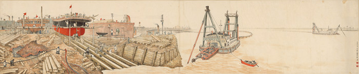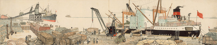 塘沽新港,孫宗慰,紙本彩墨,44×213cm,1954年,家屬提供