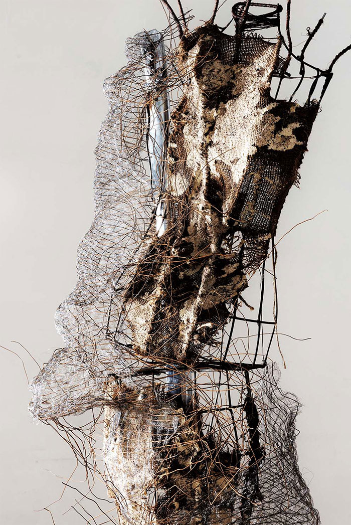 Q:絲麻織物和蝕化后的金屬絲是您在作品中反復使用的材料,這兩種材料給您什么樣的感覺?兩種材料語言在您的創作中經歷了怎樣的演變?