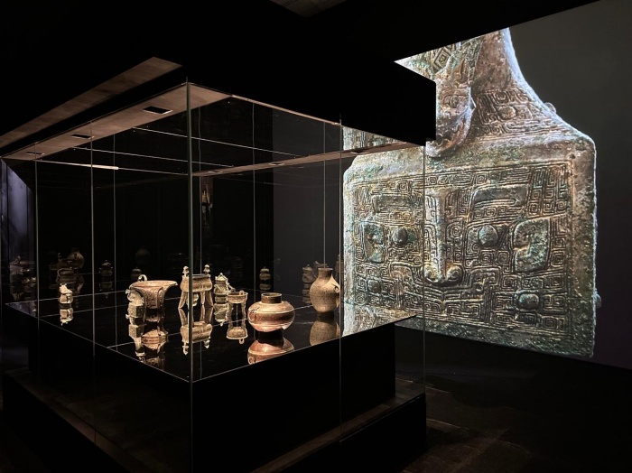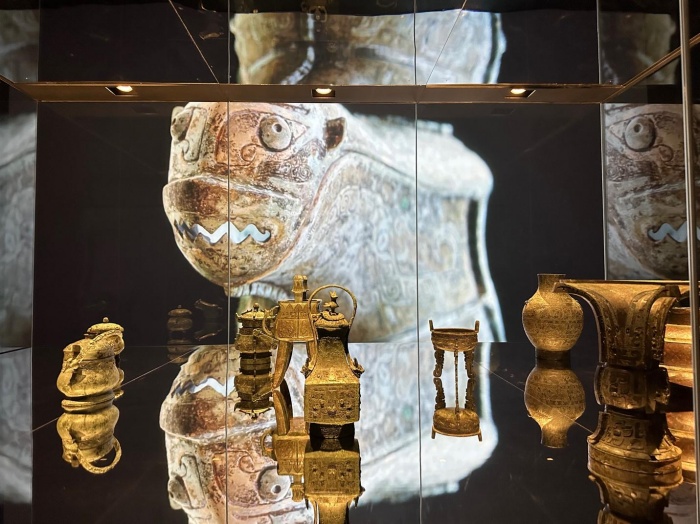 既然展覽的主題是青銅禮器,那就要讓觀者獲得對青銅器的最深印象后離去。展柜側面的一整面墻,不間斷地放映以這組青銅器3D模型制作的影片:一件又一件的青銅器依次出現,緩慢地作360度旋轉,觀者在觀展中可能未加留意的青銅器紋飾和細節,撲面而來,盡入眼簾。墻上的影像和展柜中的禮器,以及它們在鏡子中的幻影,一動一靜、一虛一實,仿佛歷史和現實,在觀者的眼前實幻交錯,明明滅滅。