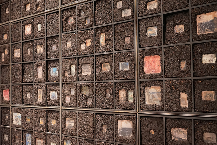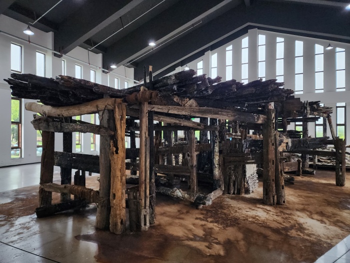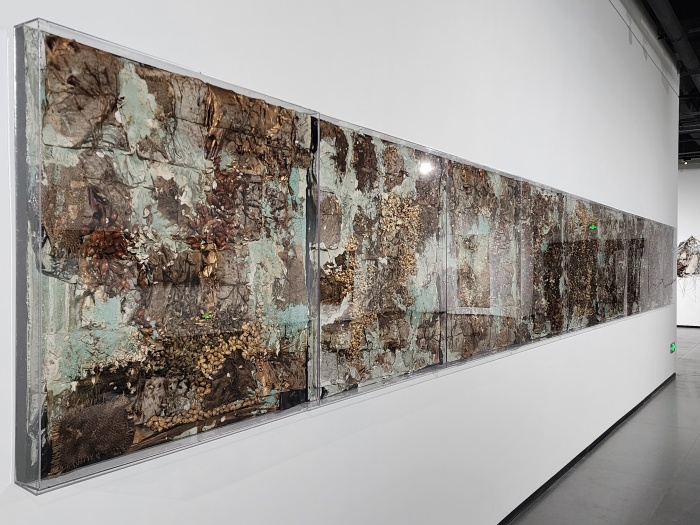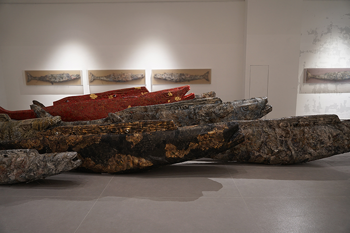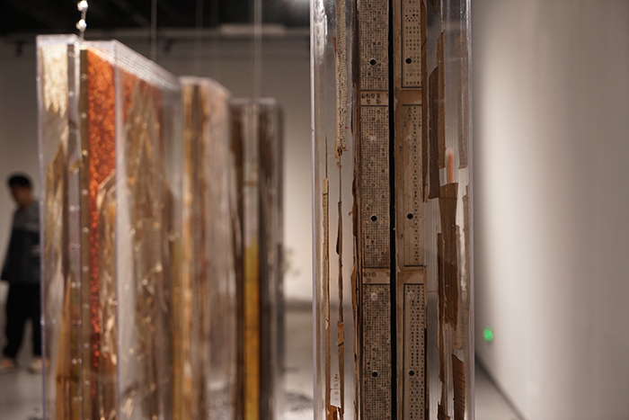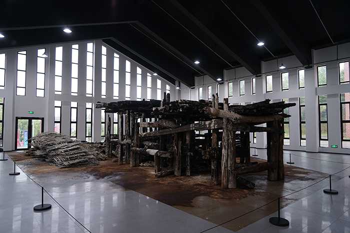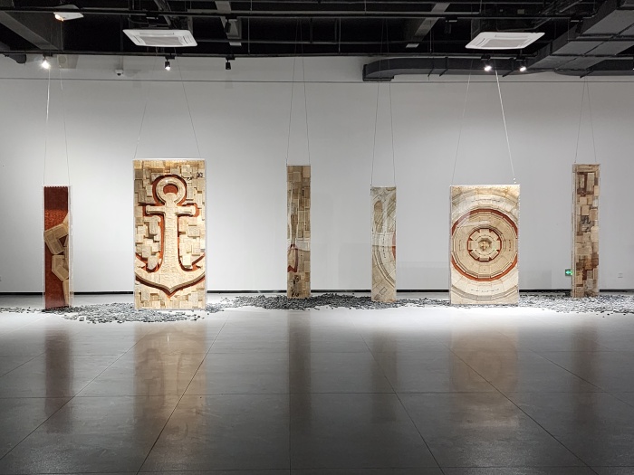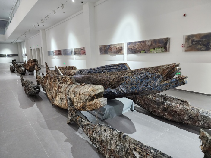 20位藝術家分別是胡偉、劉元、胡毅、秦仁強、黃秋實、黃三勝、汪三林、吳震、顏景亮、林向軍、徐海軍、張晨風、于洋、魏惠東、方志勇、陳翔宇、汪晟、王云曲、方達成、張慧亮。與大多數展覽不同,本次展覽的很多作品都在展覽現場根據展覽空間進行重新調整創作,甚至是在現場創作完成的。如胡偉先生創作的長19米、寬16米、高4.2米的作品《航跡》就是在博物館展廳里,歷時2周,現場創作而成。這件作品包含舊木、焚木、竹、金屬、麻布、宣紙、皮紙、金銀箔、海洋化石粉末、礦物·植物土質顏料等多種元素,以沉船的意象,表達出海上絲綢之路的歷史滄桑。
