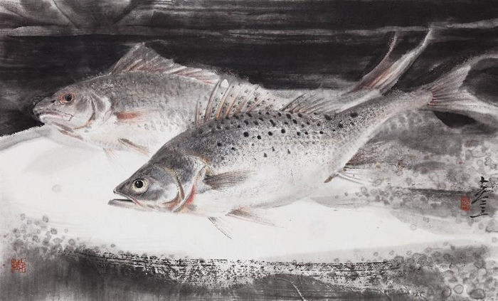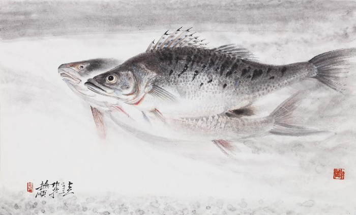 更具體地來看,博賢繪畫中深藏著一股個體的人文之思和宇宙情感,而這種情感之外卻是寄情山水而又激蕩生命的嘗試,《彼岸》 這件作品從絹本設色的青綠挑戰之外,他仍然保持了一種人心與天化的交融并生,這一點的跳脫不是依靠山巒疊嶂,亦不是煙霧氤氳,而是白舟橫渡的孤寂才顯現出了現實與理想的內與外,這一點讓人不禁想到《莊子·天下》篇中“獨與天地精神往來”的感思,“‘獨’,就心而言,它指掙脫概念因果欲望束縛的純粹觀照之主體,此主體超然孑立,獨標孤愫,由一己之情感上升到人類之情感,體現出人類的共通意識”[4]博賢的個人生命意識是充盈的,而人類的共通意識則是依靠著巨大山巒反襯而來。而另一向度的“天地精神”從何而來?是從虛空霧靄中尋得,還是從個體生命中偶遇?在另一作品《同游》系列中,兩條魚的畫面中看到了某種對生命的超越和對生命束縛的突破,這里面不再是凝重的生命本體超越的論調,而是一種活脫脫的生命情調,恰恰是魚在水中而無水的表現,才顯得萬事萬物相融并生的兼容性,它打破了客體思維的目的論邏輯,達到了一種生命自由的狀態,這恰恰說明了博賢在藝術創作中的人心趣入天化的邊界暢游之感。