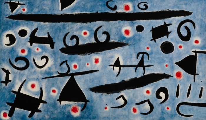 胡安·米羅,藍天上的人與鳥之舞;火花,1968年5月25日,布面油畫,173.6 × 291.6 厘米 ?巴黎,蓬皮杜中心,法國國家現代藝術博物館-工業設計中心