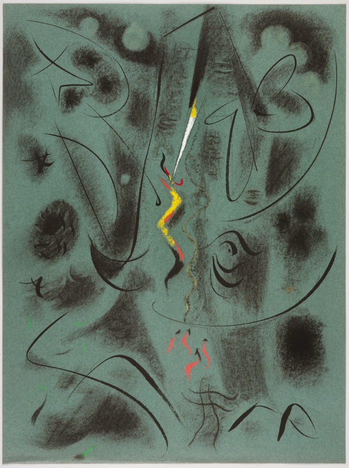安德烈·馬松,遭雷擊的樹,1945年,炭條、墨水和粉彩繪于綠色紙上,60.8 × 45.5 厘米 ?巴黎,蓬皮杜中心,法國國家現代藝術博物館-工業設計中心