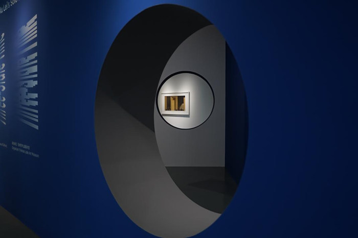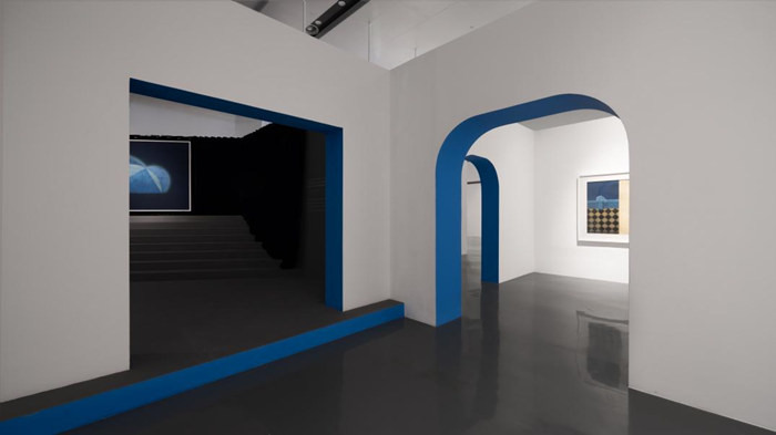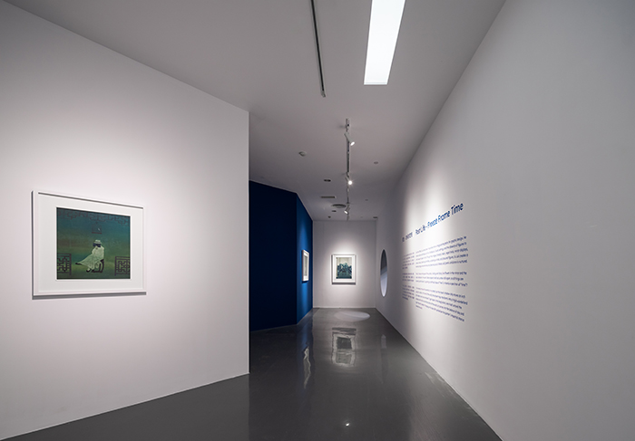 遠離喧嚷市區,鬧中取靜的蘇州尹山湖美術館,展廳設計也頗具江南特色。圓形的窗洞互相映照,跟隨45°斜角設計的步道與墻面,也如同蘇州園林般移步換景,在展館藍色風格的渲染之中,古意漸生。帷幔、重屏、空椅、籠鳥、鏡戲、夢蝶、石影,“前生·時間的定格”單元中的大部分作品,都帶著類似的古樸意趣。