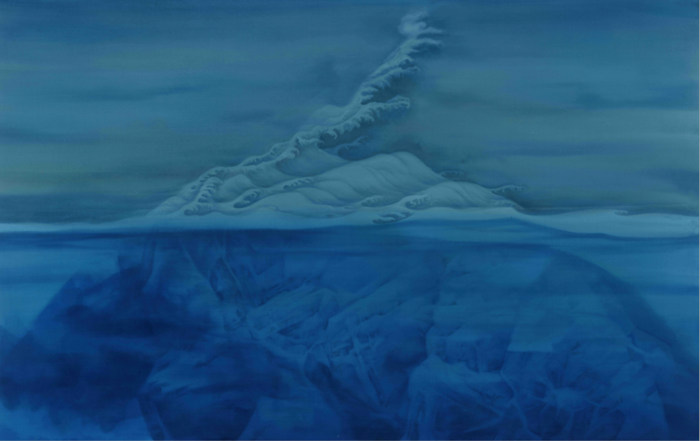這正是對第一單元“前生·時間的定格”精妙的收尾,而藝術家九十年代作品中的孤獨,在進入本世紀后漸漸稀釋為一種開闊的平衡。以這一變化為分野,展覽進入第二單元“浮生·時間的平行”?!妒侠恕芬院F矫鏋榉纸?,深水下的巨石掩映在流動與寧靜、水面與深淵之間,海平面往上,石頭隨著無窮漫長的時間漸漸化為洋流與云層,消逝于深邃的天空。在這幅作品中我們發現徐累強調的“繪畫符號本身的平衡”,山岳在海平面上下隱現,經過白云蒼狗,最后形成一體。