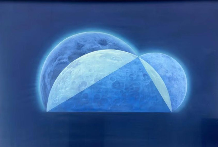 徐累對月亮主題情有獨鐘,也構成了他近期新作的創作靈暈。他引用伊塔洛·卡爾維諾(Italo Calvino)《命運交叉的城堡》中的語言,形容月亮“是充滿意義的世界,包括了那些對詞語和事物最完整的詩韻記錄?!边_·芬奇曾經計算過的“月牙定理”,被藝術家以繪畫的形式呈現,作品置于在黑色的幕景中,猶如深沉黑夜下理性秩序與神秘感性的交織顯影,也喚起我們心理上的無限測量。