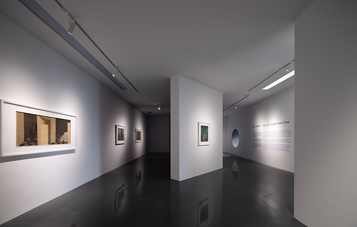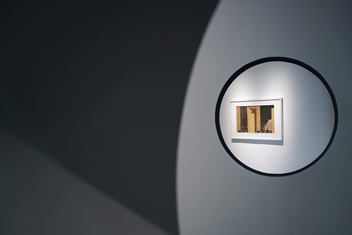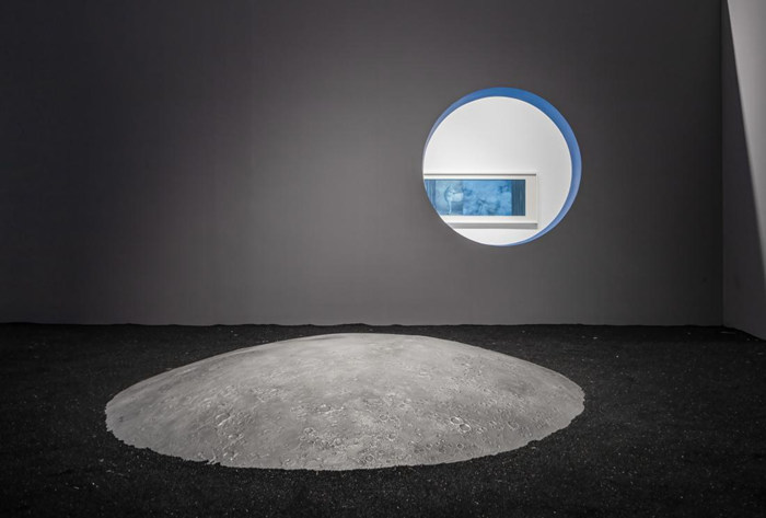 徘徊踱步于展廳之中,在透過互相映照的圓形洞窗,我們看到“永生·時間的寓體”單元以月亮為主題的一系列作品,漂浮在海上的月亮,白晝歸巢的月亮,輪回重影的月亮,以及藝術家為蘇州尹山湖美術館本次展覽特別構思的裝置作品《隕月》——半掩地表,露出表面坑洼的月壤,仿若通往藝術家構筑的理性與浪漫的神秘情境,重新定義了尹山湖美術館江南園林特色的設計風格。